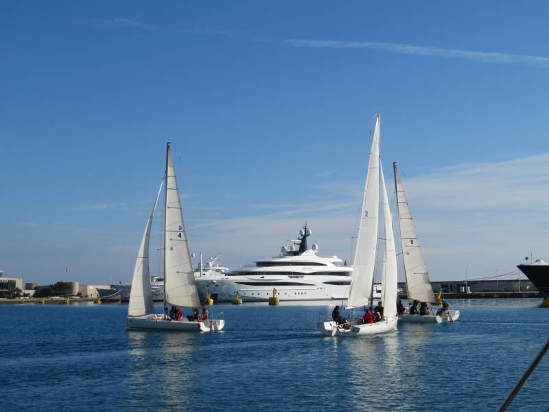 Dat is een mijl of 8 verder varen, maar de wind haalt aan tot 20 kopen en met 8 knopen zeilen we er vlot heen op een koers bijna voor de wind. Na de laatste kaap van de dag komt Antibes in zicht. Er wordt hier volop gezeild door kleine boten. Een groepje optimisten is bij 22 knopen wind aan het planeren met verbazingwekkend hoge snelheid - zo te zien halen ze ongeveer 8 knopen.