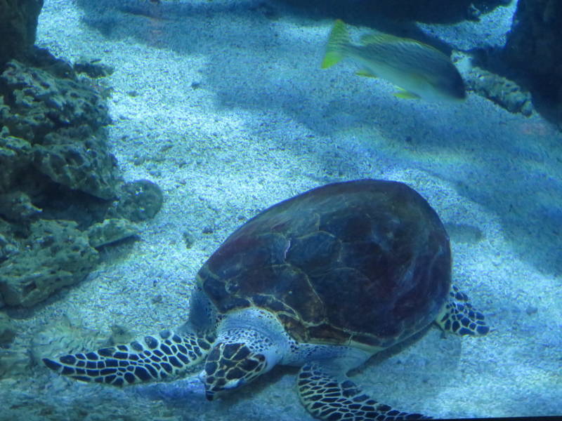 Maar het gaat in dit museum niet over mensen - alle ruimte is er voor het zeeleven. Er is een groot aquarium met heel veel tropische vissen en ook diverse soorten haaien, en grote schildpadden. Alles kun je op je gemak bekijken - zonder al het gedoe van zelf moeten duiken.