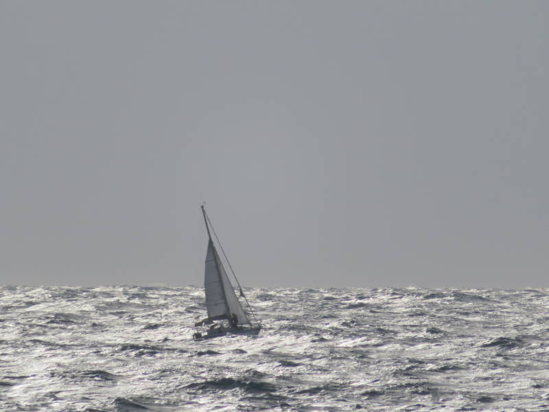 Dan zie ik een zeiljacht van een meter of 10 wat met storm fok en twee keer gereefd grootzeil. Het vaart in de ruwe zee en probeert aan de wind tegen de golven in te zeilen. Dit moet echt een liefhebber zijn - om onder deze omstandigheden te willen zeilen. Of is het iemand die in de luwte van 5 kilometer verderop gedacht heeft dat het wel zou meevallen en nu in de volle wind net buiten Imperia erachter komt dat het te veel van het goede is?