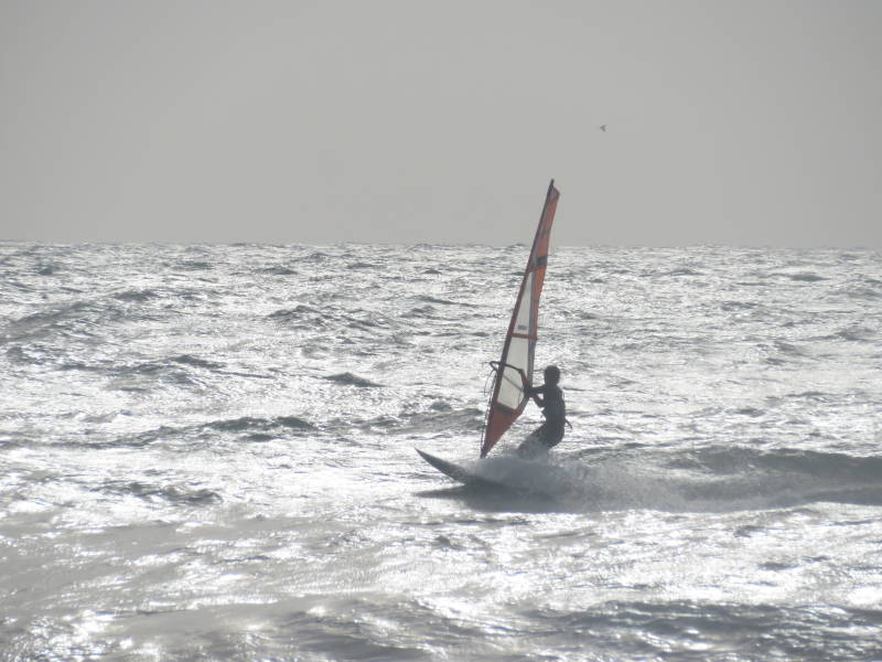 Ik haal de kinderen erbij en met zijn vieren bewonderen we de kunsten van deze windsurfers. Ze slagen erin door de hoge brekende golven naar zee te varen. Dan maken ze hoge sprongen, rijden ze op de golven en gijpen achteloos, alsof het niets is.