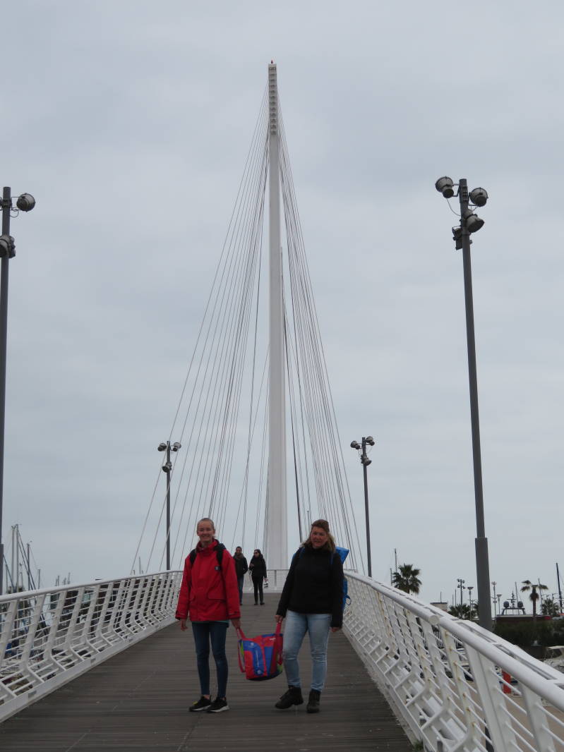 Maandag was wasdag - en de droger was in de stad - dus moesten we een stuk lopen met het wasgoed. Deze fraaie hangbrug is de loopverbinding tussen jachthaven en stadscentrum.