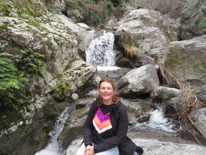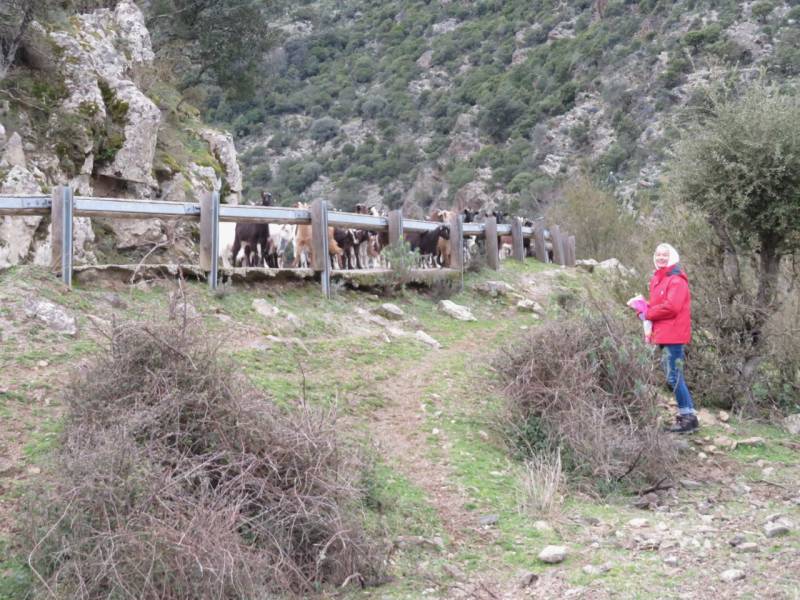 Na nog een korte stop voor aanschaf van brood rijden we eerst een stukje zuidelijk en dan westelijk de bergen op. Voor ons rijden twee vrachtauto’s die met een slakkengang de berg opgaan, dat geeft ons des te meer gelegenheid om ons heen te kijken. We rijden steeds naast een kloof met diep daarin een snelstromende beek.