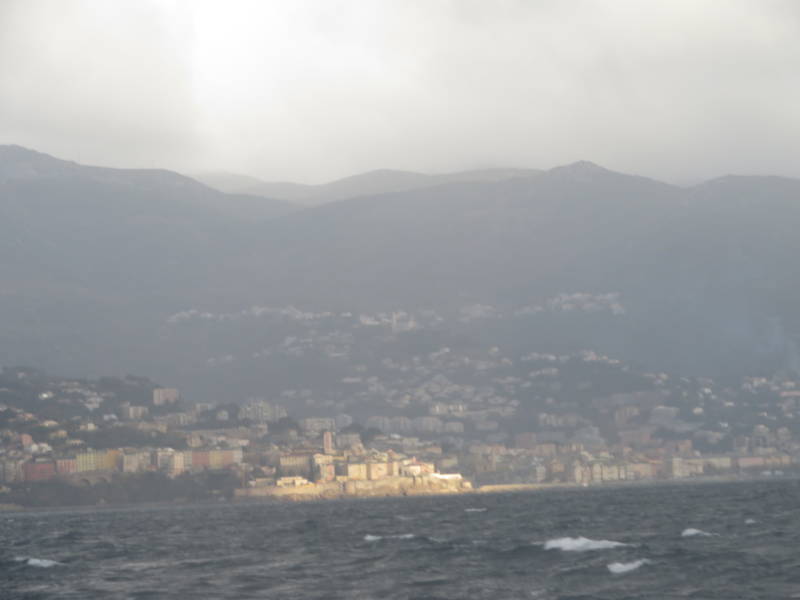 Er komt geen enkele windvlaag van de bui - dat is een geruststelling. Wel is er een regenboog, mooi om te zien. Even later is heel Bastia donker, behalve de oude stad, die volop in de zon staat. Net alsof er een spotlicht vanuit de hemel gericht staat op onze haven van afgelopen twee dagen.