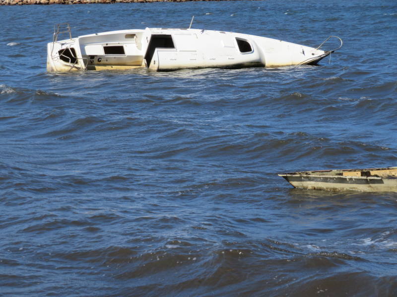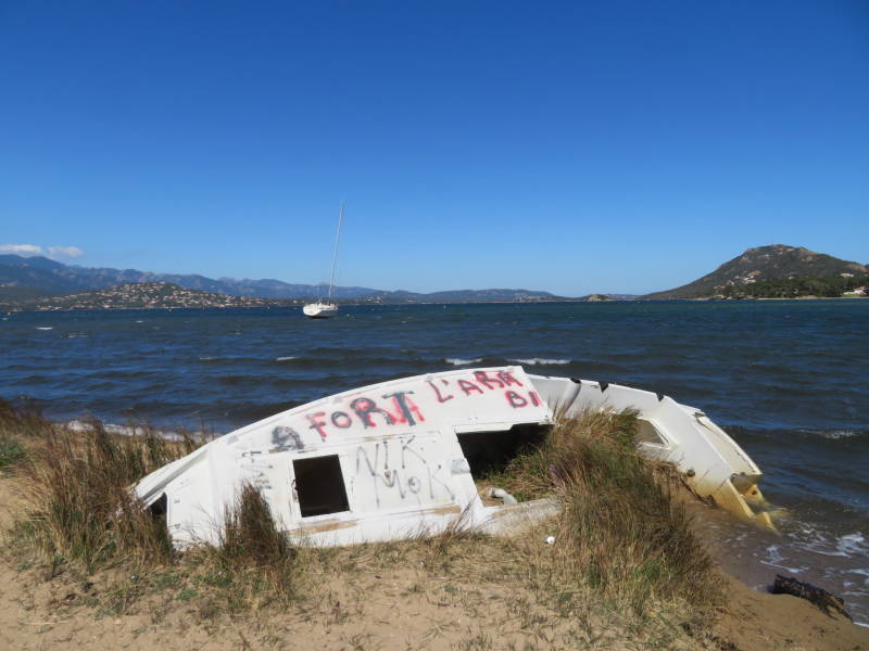 Navraag bij de havenmeester maakt duidelijk dat de meeste wrakken van plezierjachten zijn ontstaan tijdens ankeren. Wat meestal gebeurt is dat de eigenaar tijdens de zomermaanden een paar weken aan boord is en vrolijk rond Corsica vaart. Dan laat de eigenaar het schip in de baai bij prachtig weer voor anker achter, want dat is veel goedkoper dan die dure jachthaven. Het jacht blijft onbeheerd achter, voor anker. Een paar weken of maanden later is er een enorme storm, het anker houdt het niet. Het schip drijft dan met krabbend anker naar de rotsen. Einde oefening. Het meest recente wrak is de blauwe tweemaster die tegen de kant aanligt - dat is nog maar twee maanden geleden gebeurd. Waarom bergt niemand de wrakken? Welnu, de Gemeente Porto Vecchio en de prefecture Maritime zijn aan het bakkeleien wie voor de kosten moet opdraaien. De gemeente redeneert dat ze in de Middellandse zee liggen, want het is zout water met eb en vloed - zee dus. Conclusie: de Prefectuur moet betalen. Dat ziet de Prefectuur heel anders, omdat als elk wrak ligt op een denkbeeldige lijn die aan beide uiteinden in gemeente Porto Vecchio uitkomen - dat kan nog wel even duren voor dat is opgehelderd. Hier zullen nog wel een paar juristen wat over te zeggen hebben.