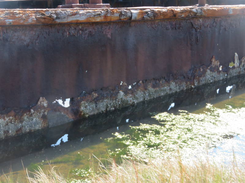 Er liggen aan het ondiepe zuidelijke eind van de baai een paar totaal verroeste pontons - let op de gaten in de romp. Deze pontons zijn beroepsmatig gebruikt geweest en lijken hier moedwillig achtergelaten. Kennelijk was hier dumpen goedkoper dan naar de oudijzerboer verslepen.