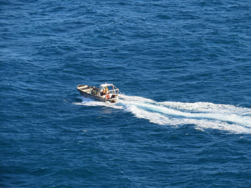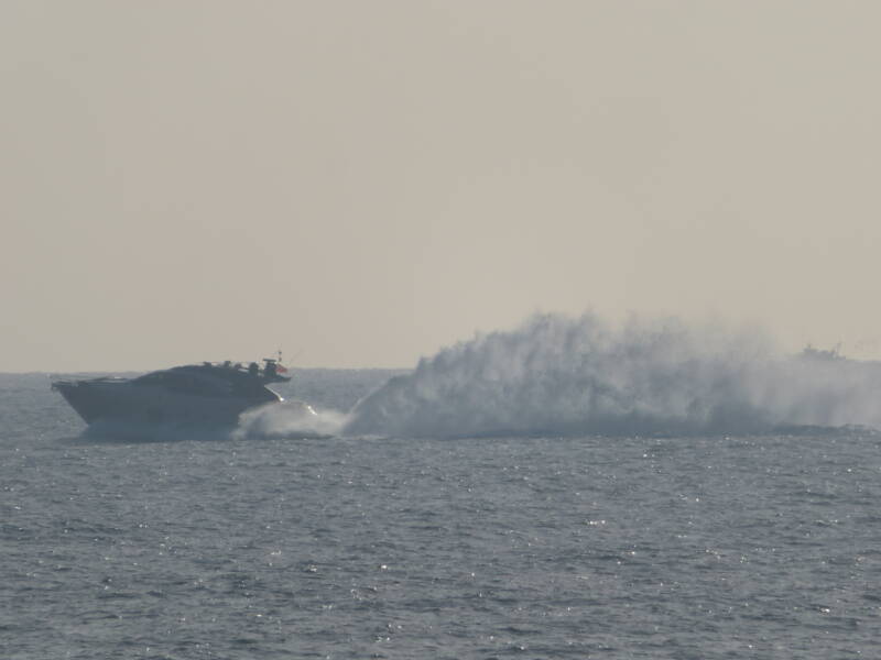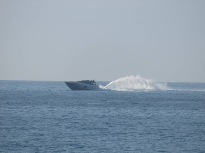 Deze vissersboot bij Monaco planeert ook. Het golfpatroon is hier verstoord door de flinke deining op de zee.
