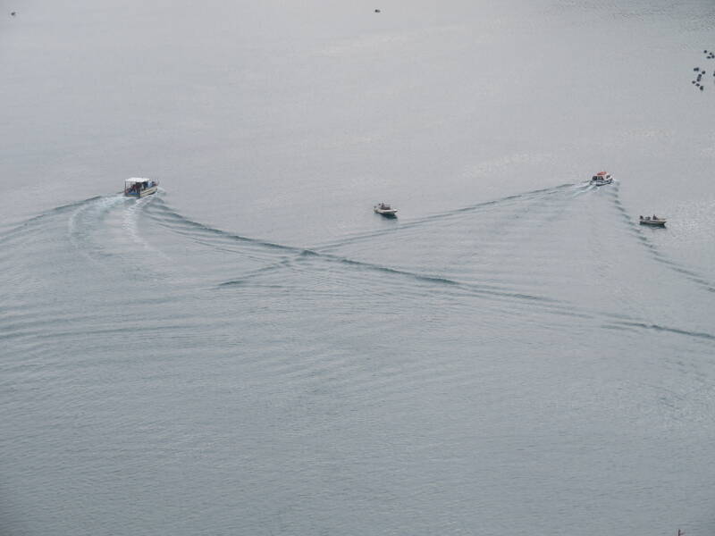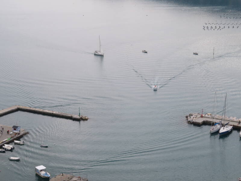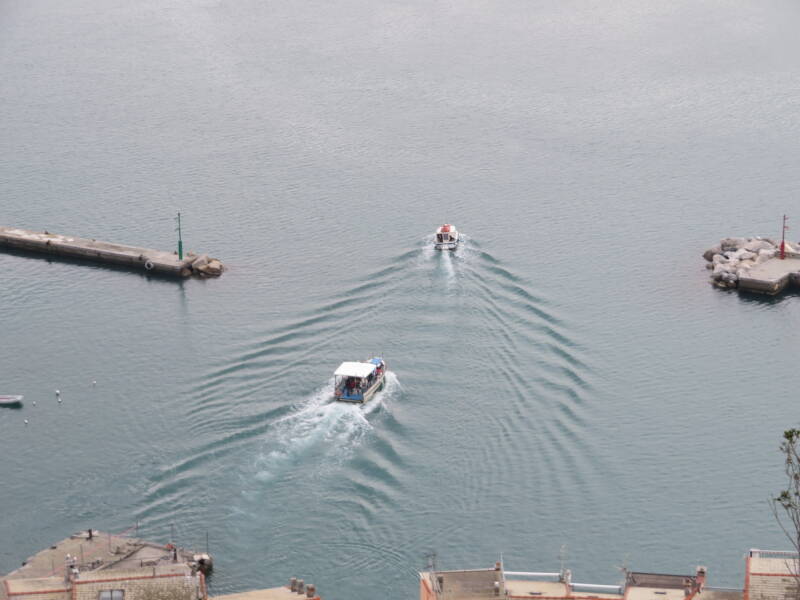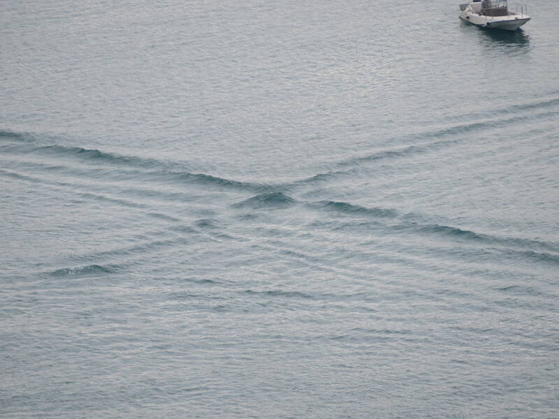Dit kun je het beste zien vanuit de lucht. Bij onze dag bovenop het kasteel van Portovenere was het uitzicht prima en het weer was bijna windstil. Perfect om golfpatronen te observeren. Schepen waren er genoeg, kijk maar eens.