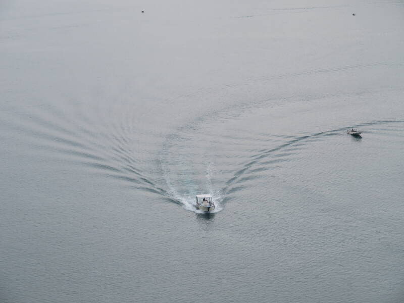Hier varen twee schepen achter elkaar de haven uit. Bij het voorste schip zie je de boeggolf (eigenlijk de schouder golf) die als een V-patroon uitwaaiert. Bij het hek zit ook een V-vormige golf, maar deze is minder hoog. Vlak rond de boot is een wit spoor - dat is van schuimvorming doordat de golven breken vlak bij het schip, verder weg van de hartlijn van het schip is het golfpatroon zonder wit schuimspoor. Een paar bootslengten achter het schip hebben de schoudergolven van beide kanten weer contact gemaakt en zie je een golfpatroon wat de schoudergolf aan bakboord verbindt met die aan stuurboord.