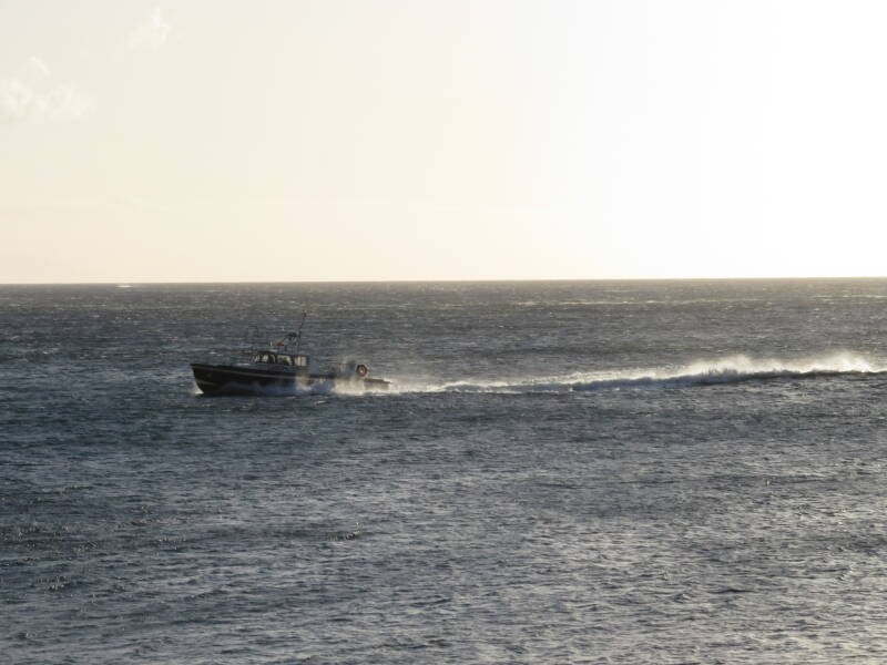 Deze loodsboot (haven van Bastia) heeft weinig massa en is een rank schip. Het schip planeert ongeveer even snel als het schip hierboven met veel minder opspattend water. Zo kan het dus ook. Een paar bootslengten achter het hek waait de hekgolf door een windkracht 7 dwarswind weg - hier komen druppels los van de golven en zie je een wit schuim en een wolk van druppels.