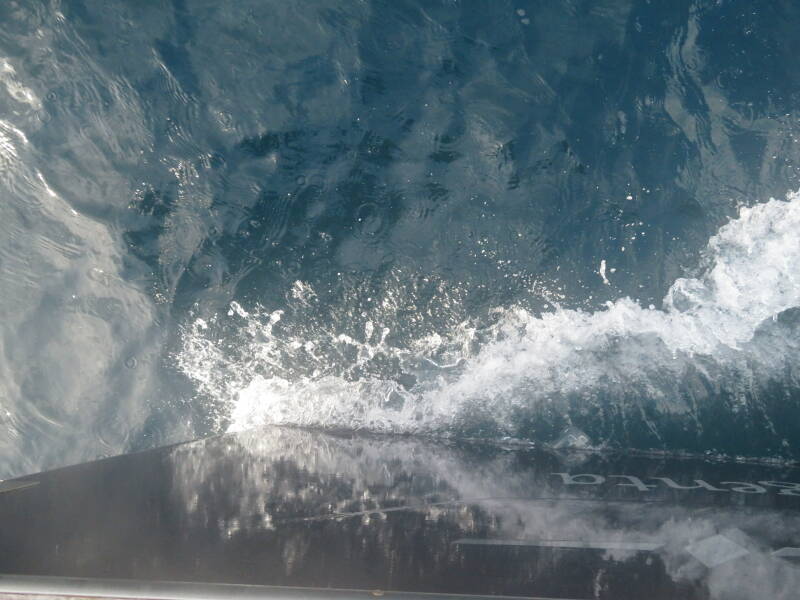 Tenslotte - de boeggolf van de Bleu Magenta van bovenaf gezien aan stuurboord bij een snelheid van ongeveer 4 knopen. Mengen van water en lucht zorgt voor de witte verkleuring van het water.