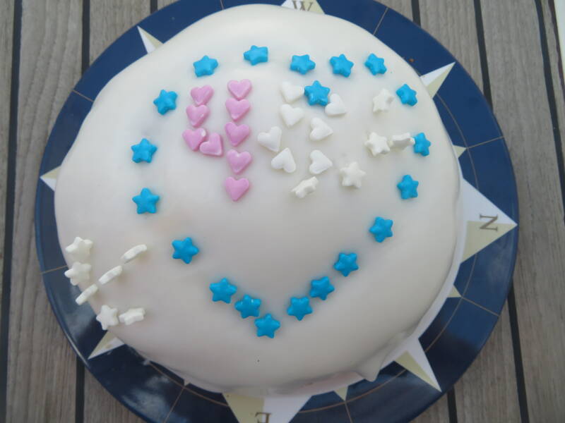 Dan de taarten - daarvan moeten er gewoontegetrouw genoeg van zijn. Doorgaans bakt Marttje alles, maar dat wilde ze met haar verjaardag niet, Dus heeft Edwin een taart versierd, en werd er een chocolade schuimtaart gekocht bij een patisserie.