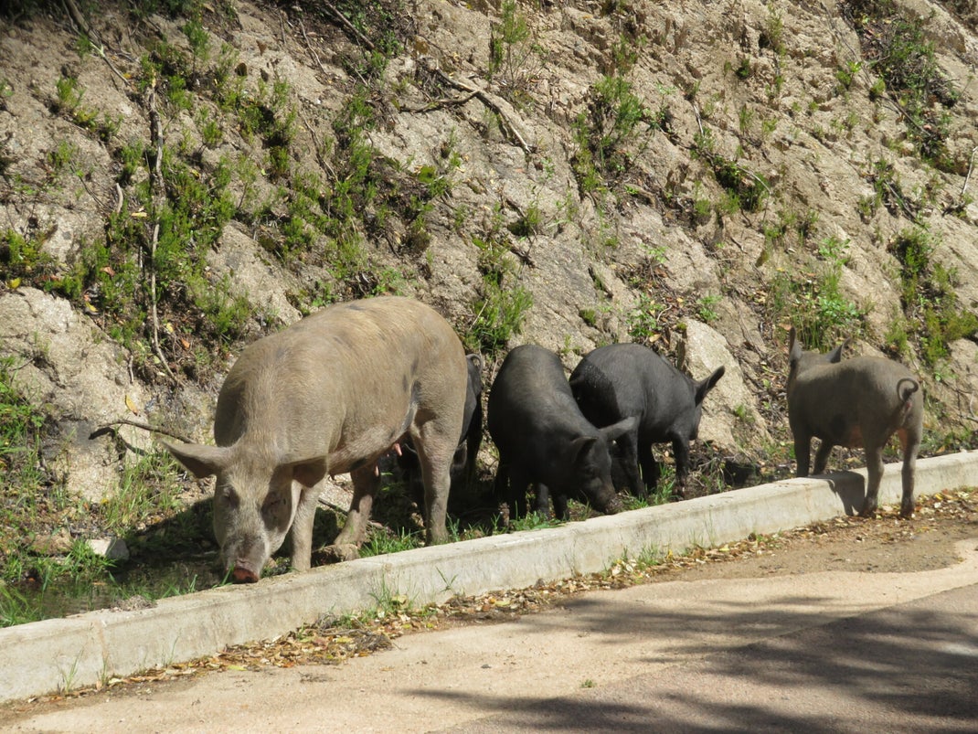 Dan dalen we weer een heel eind - tot een beek - en klimmen weer helemaal naar 800 meter hoogte. Onderweg komen we de favoriete maaltijd van Obelix tegen.