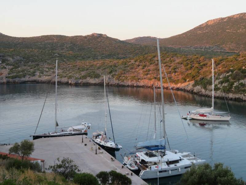 De kade waar ze vanaf springen maakt dan een haakse bocht en hier kun je aanmeren over een lengte van ongeveer 40 meter. Iets verderop ligt een groot Frans jacht voor anker in het midden van de trechter. We doen een poging om in MED-mooring stijl aan te leggen, laten het anker zakken, gaan achteruit naar de kade. Met hulp van een Griekse hengelaar komen we aan de bolders, maar dan merken we dat ons anker niet goed houdt - de bodem heeft veel rotsen. De hengelaar gebaart ons dat we ook gewoon langszij de kade mogen gaan omdat het toch erg rustig is. Om die manoeuvre te laten slagen gaat Maaike Grytsje eerst aan land - de hengelaar begrijpt niet hoe wij de landvasten willen hebben en doet steeds iets contra-productiefs. Niet uit kwade bedoeling, maar uit onbegrip; aanmeren is tenslotte iets totaal anders dan hengelen.