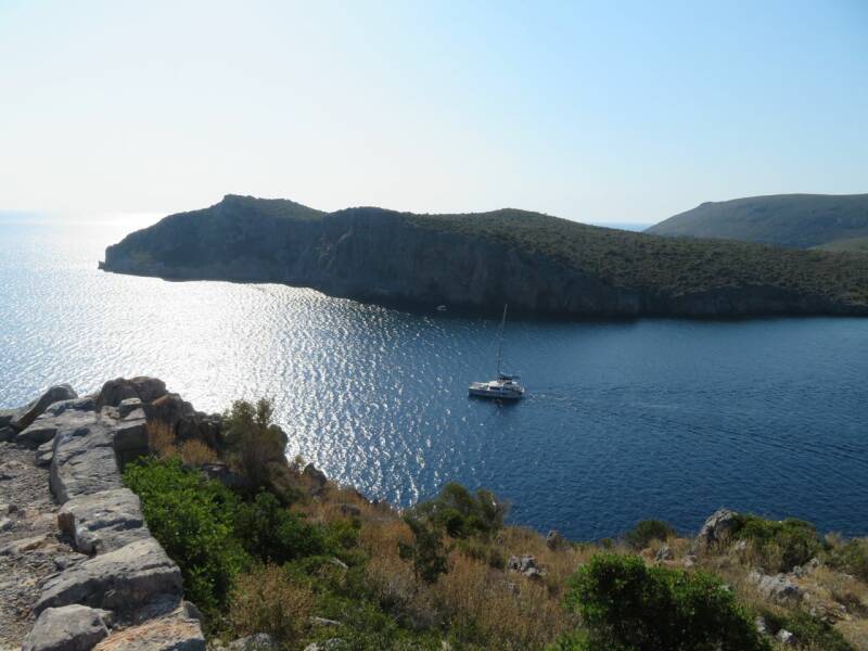 Na een half uurtje genieten beweegt er iets. Ik zie het topje van een hoge mast net boven de rotsen - het Franse jacht dat voor anker lag is vroeg uitgevaren en gaat zo te zien in de richting van Monemvasia.
