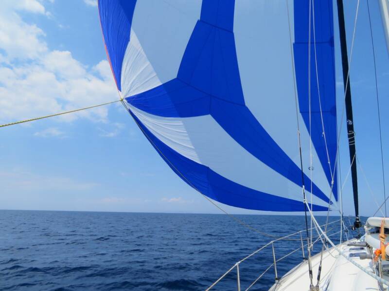 Op driekwart van de route moeten we een keer gijpen - maar dat hadden we nog niet eerder gedaan met een genaker. De omstandigheden zijn ideaal - we varen 4.5 knopen en de wind is 7 knopen, nauwelijks golven, dus we wagen het erop. Gijpen blijkt verrassend eenvoudig - je gooit in een keer de ene schoot helemaal los, zet de autopiloot snel op de nieuwe koers (ruime wind over de nieuwe boeg) en haalt dan de schoot over de nieuwe boeg in. De schoothoek gaat helemaal buitenom de voorstag en daarbij is alle druk uit de genaker - en kun je hem snel inhalen. Het is in een halve minuut gepiept - twee slapenden aan boord zijn niet eens wakker geworden.