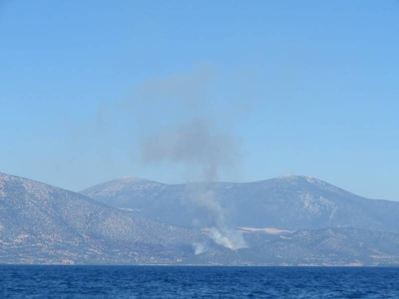 Even later ruiken we een brandlucht en komt er witte as naar beneden dwarrelen. Het is een natuurbrand. Zo te zien is de brandhaard ten noorden van Navplion, misschien 10 tot 30 mijl verderop.