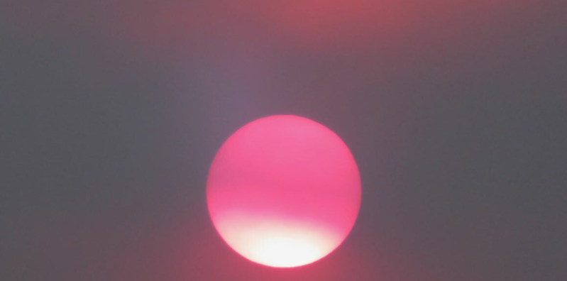 De wolken laten de zon verkleuren van de normale helder gele felle kleur naar een rood-oranje. Ook het water krijgt een oranje gloed.