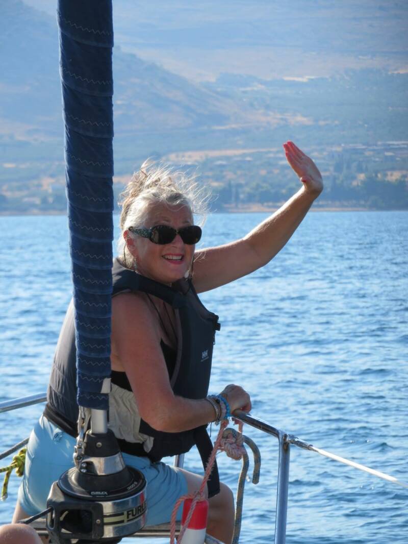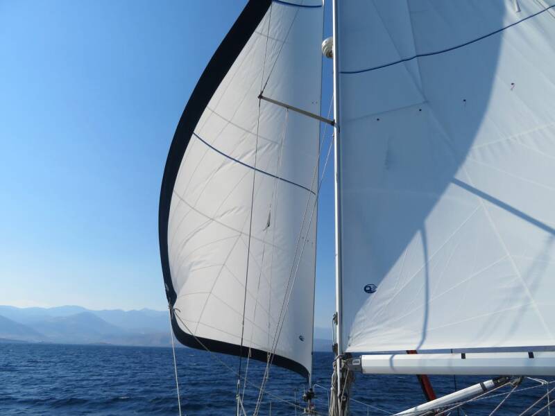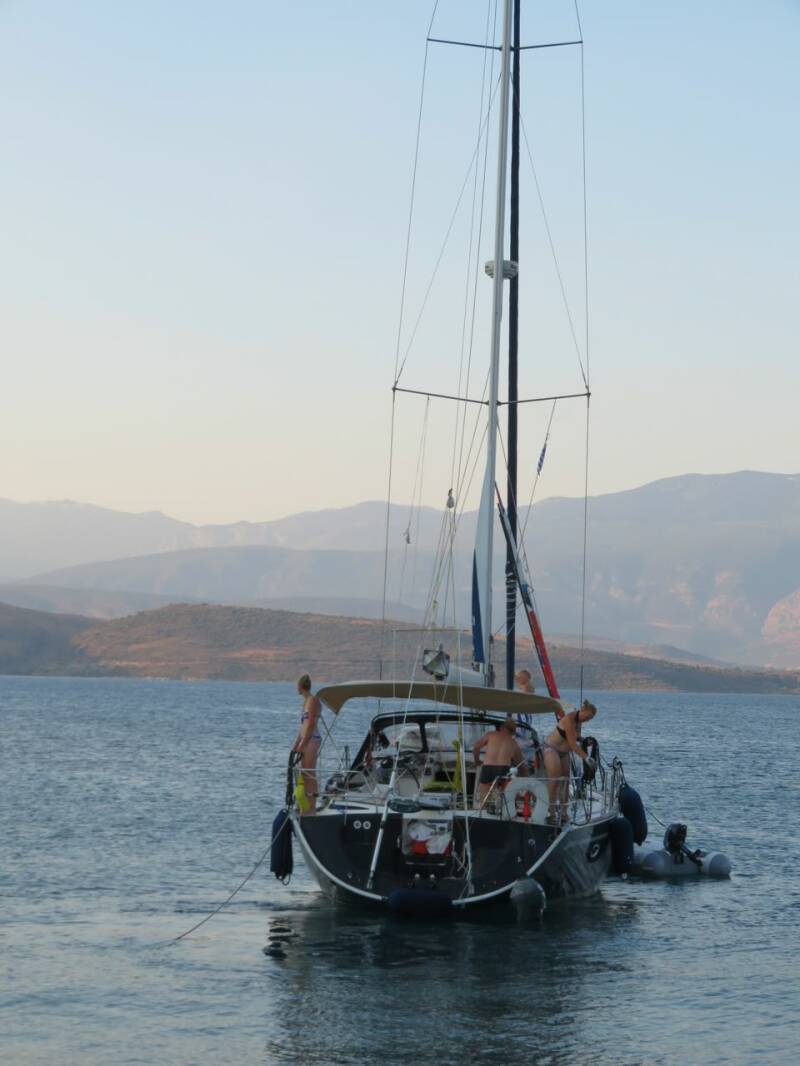 Een half uur later zakt de wind helemaal in. Weer een uur later is de wind 180 graden gedraaid. Dat is zeilen in de Golf van Korinthe - overal om ons heen zijn hoge bergen - je zeilt steeds in de luwte van een berg, of in het waai-gat tussen twee bergen in. Er vaart een jacht op een mijl afstand van ons in dezelfde richting - deze twee master heeft geen zin in zeilen en doet alles op de motor.