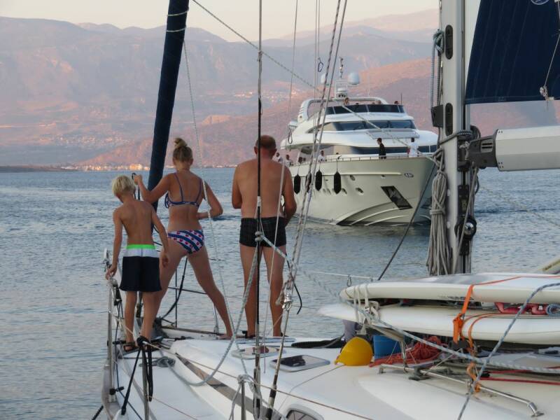 Terwijl de Mamma Mia afmeert raken ze ons bijna - er staan twee man klaar met grote bol boeien - maar ze keuren ons geen blik waardig. Aanwijzingen die ik - goedbedoeld - geef om schade te voorkomen worden straal genegeerd door de crew die met marifoon met elkaar en de kapitein overlegd.